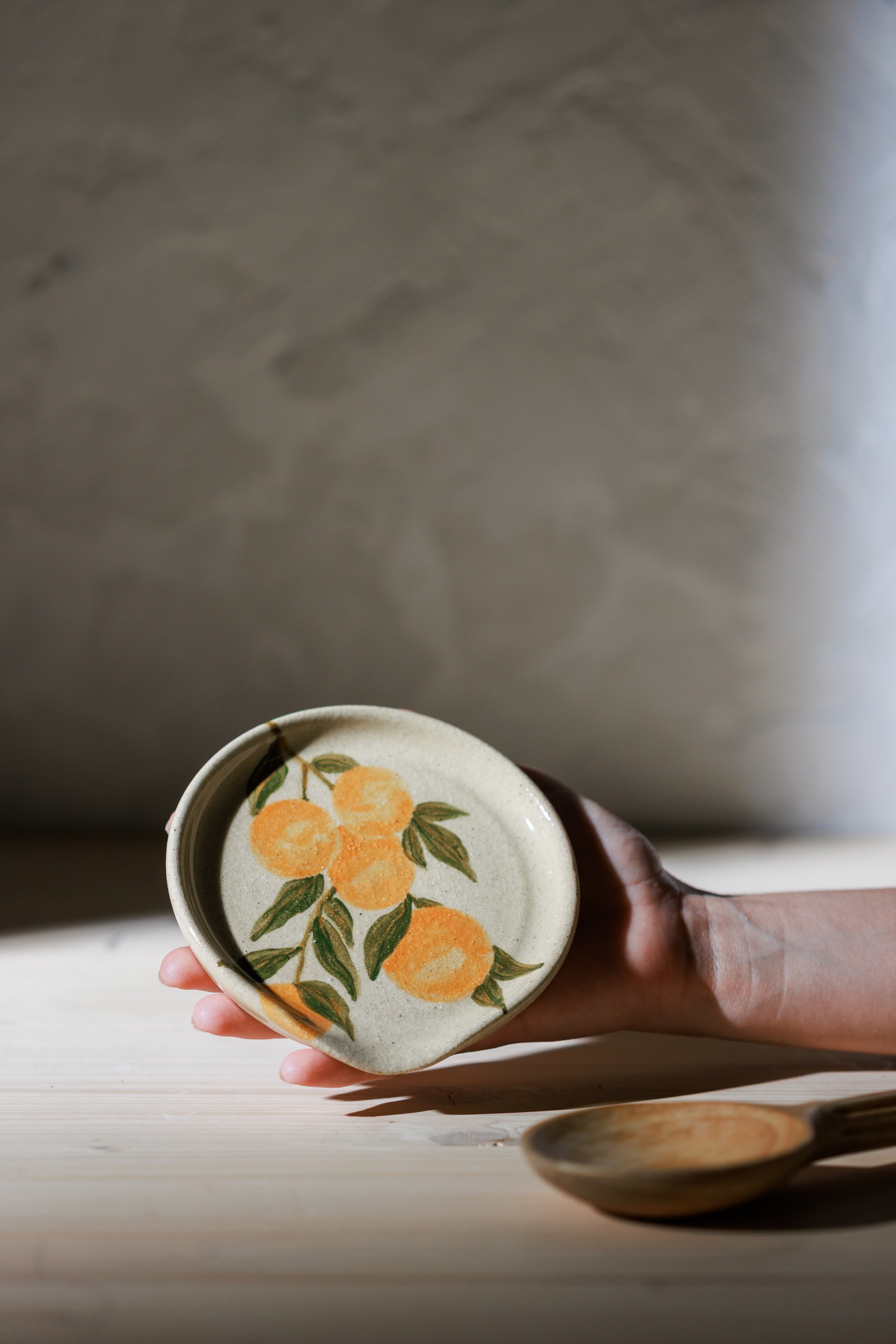 This stoneware piece is crafted from our white stone clay with a hand painted citrus fruit design with glossy clear finish. Resting on your stovetop or kitchen counter, we hope this spoon rest will bring beauty and simplicity to your home.
