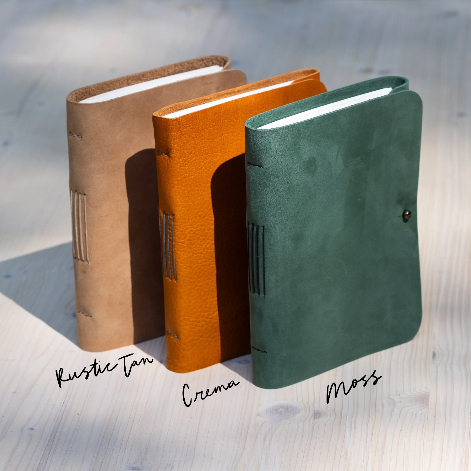 The latest addition to our history-booking journals, The Mini-Visual Journal is the perfect size for visual journaling on the go. Featuring a collar button closure and 24 pages of Canson multi-media paper, this sized visual journal comes in our leathers Crema, Moss and Rustic Tan. Created with versatility in mind, this book is great if you're just starting to practice visual journaling, want something that's easier to travel with or want a more size friendly journal for a child.