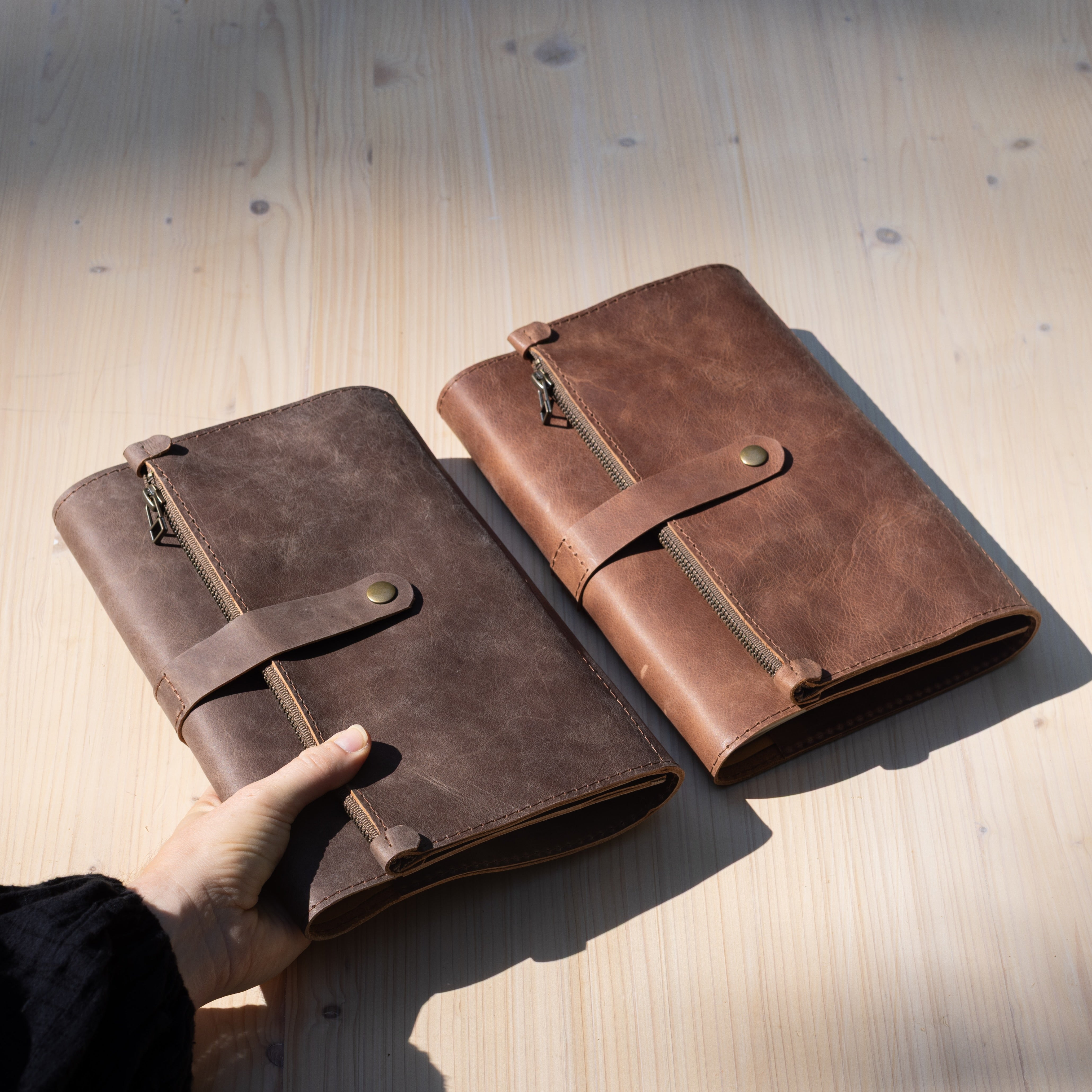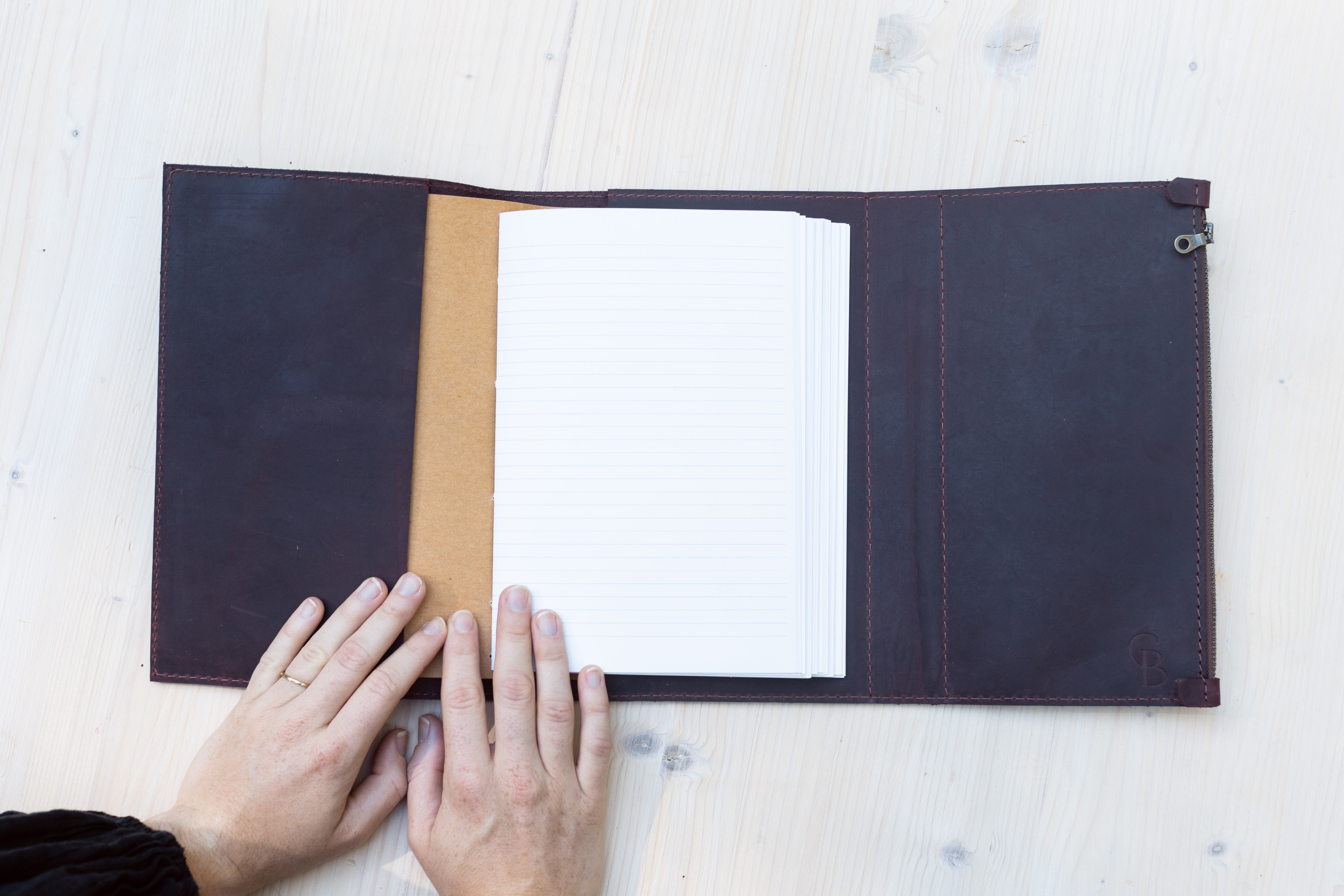 Meet the Refillable Journal Sleeve, our only journal option that can be “refilled”! This leather cover includes our heavy-duty recycled paper bound Kraft-Tex Journal that slides securely into leather leather panels within the sleeve. Once the journal is filled with your notes, prayers, songs or whatever else you may jot down, you can remove it from the sleeve, purchase our Kraft-Tex Refill Journal, and restart the whole process! Available in our Rustic Brown, Stone, Burgundy and Rustic Tan leathers; our Refillable Journal Sleeve also features a zipper pocket to store writing utensils to carry with you on the go.