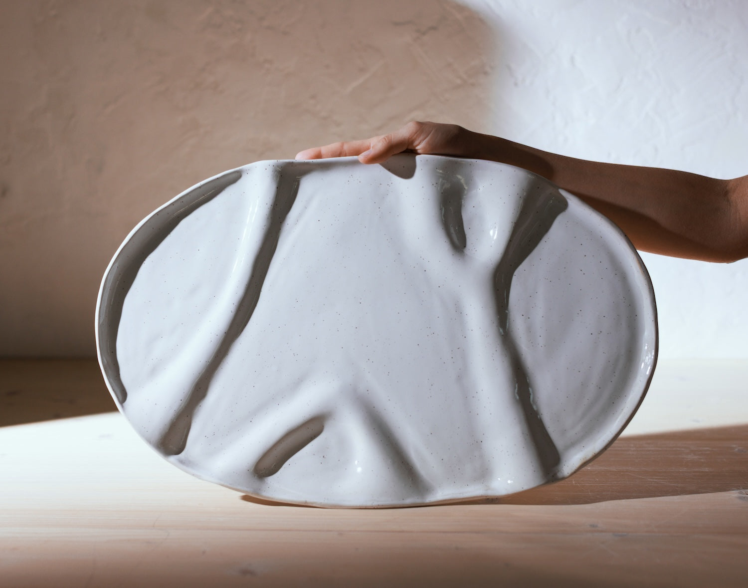 Crafted from our signature sandstone clay and salt white glaze, this serving platter has a wavy movement that creates a special centerpiece when hosting or serving. This platter was hand built and is perfect for charcuterie or your favorite holiday goodies. Whether on your dinner table for a family meal or kitchen counter to gather around with friends, we hope this platter will bring beauty to your home.