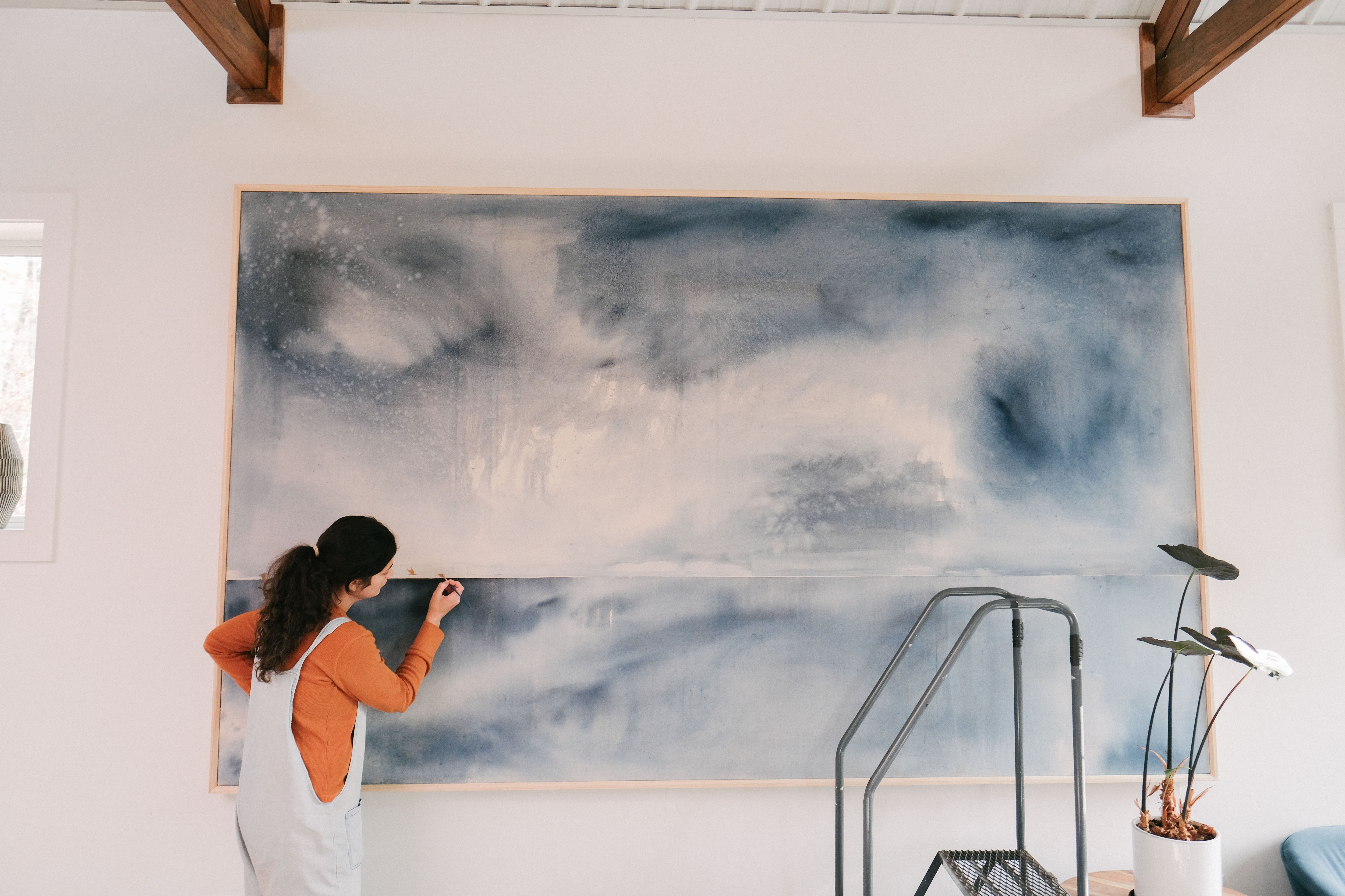 Print of a portion of 6x10' unprimed canvas, painted with pure indigo pigment and gold ink.