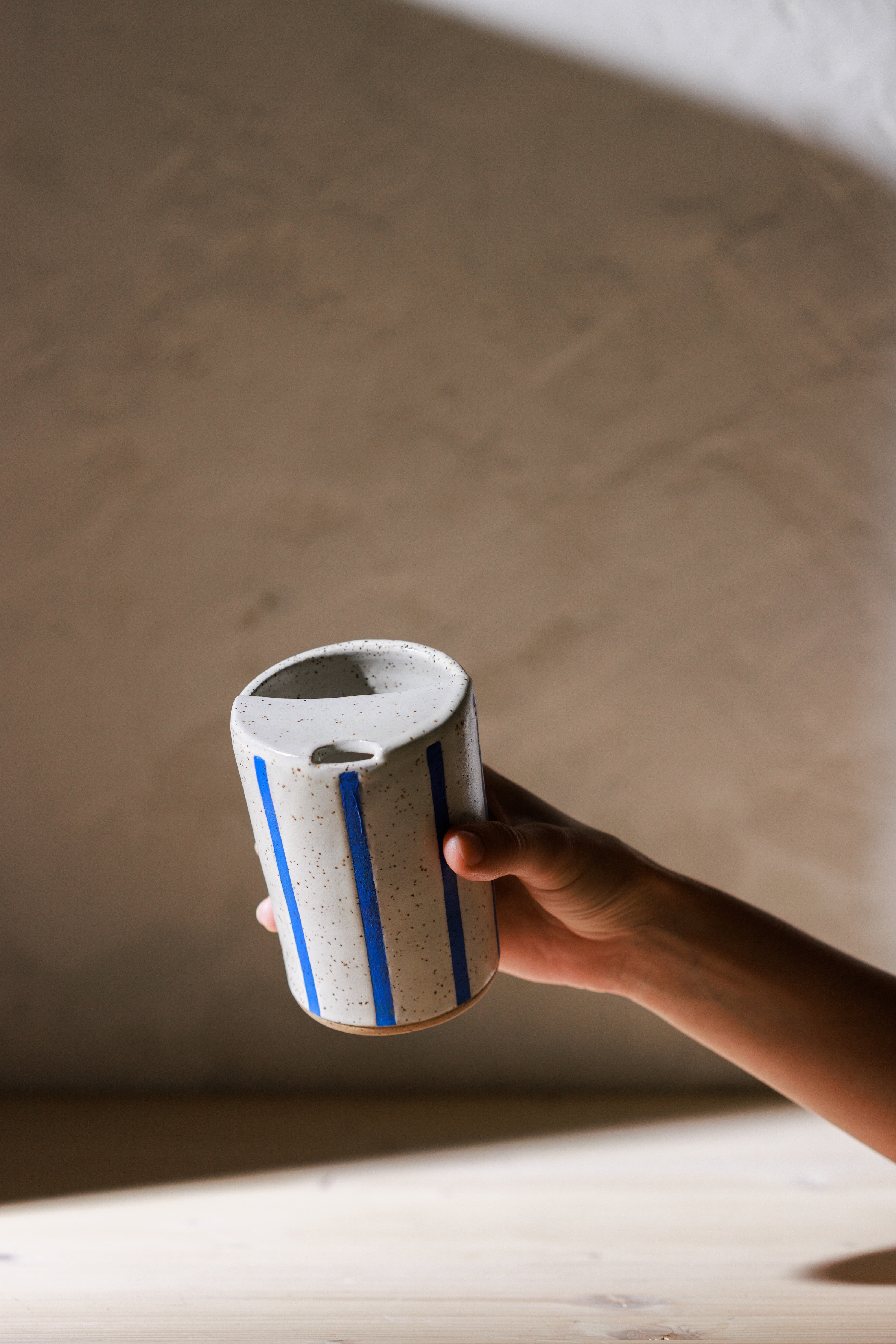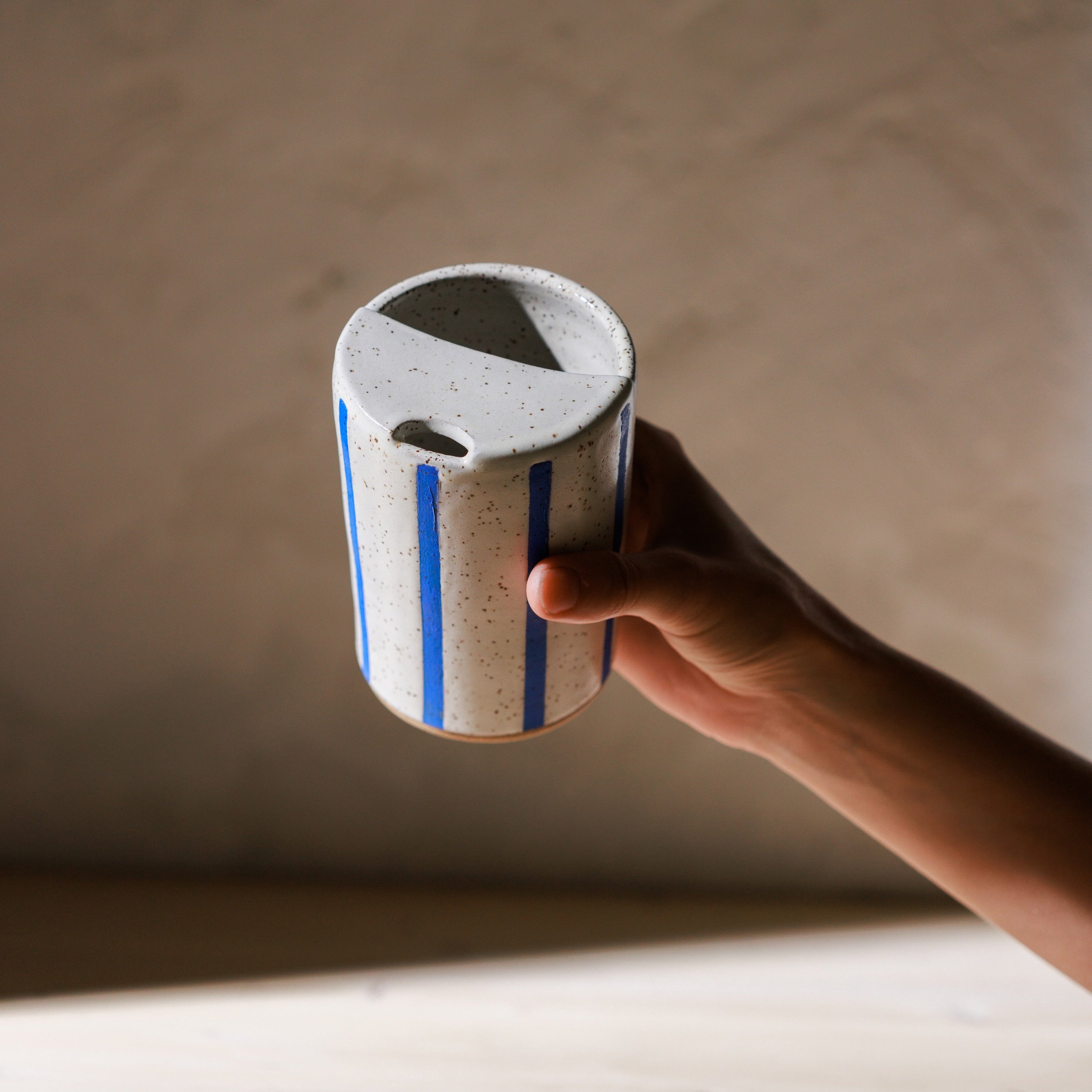 Hand thrown with speckled clay, the Travel Tumbler was designed so that you can take your favorite hot or iced beverage to go. This tumbler features a hand painted stripe design in electric cobalt blue. Whether you are drinking an iced coffee or hot coffee on the go, the Travel Tumbler will be the cup you want to reach for.
