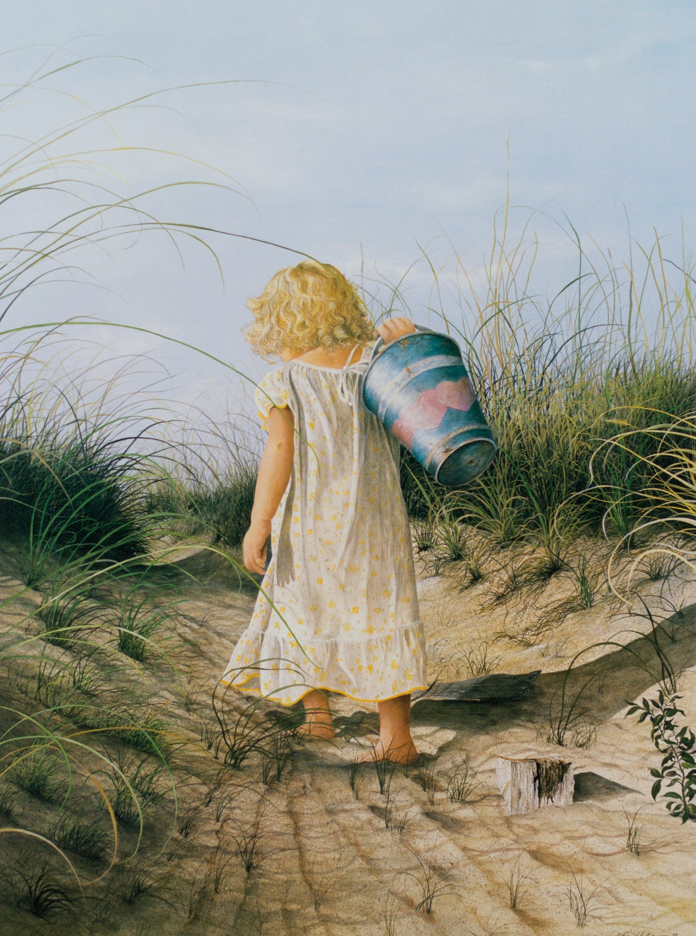 No picture I’ve ever painted has ministered to more people than the “Little Child” has.  Yes, the little child is our youngest daughter, Sarah.  At summers end we’d always vacation at a family on the coast of North Carolina, and Sarah would always make me promise to get up with her to collect shells on the beach.  I didn’t mind making that promise, but what I dreaded those morning was how early she’d wake me by waving a sandy bucket over my head, reminding me, “Daddy, you promised.”  On one of those mornings as I staggered out of bed to follow her I had a camera and said,