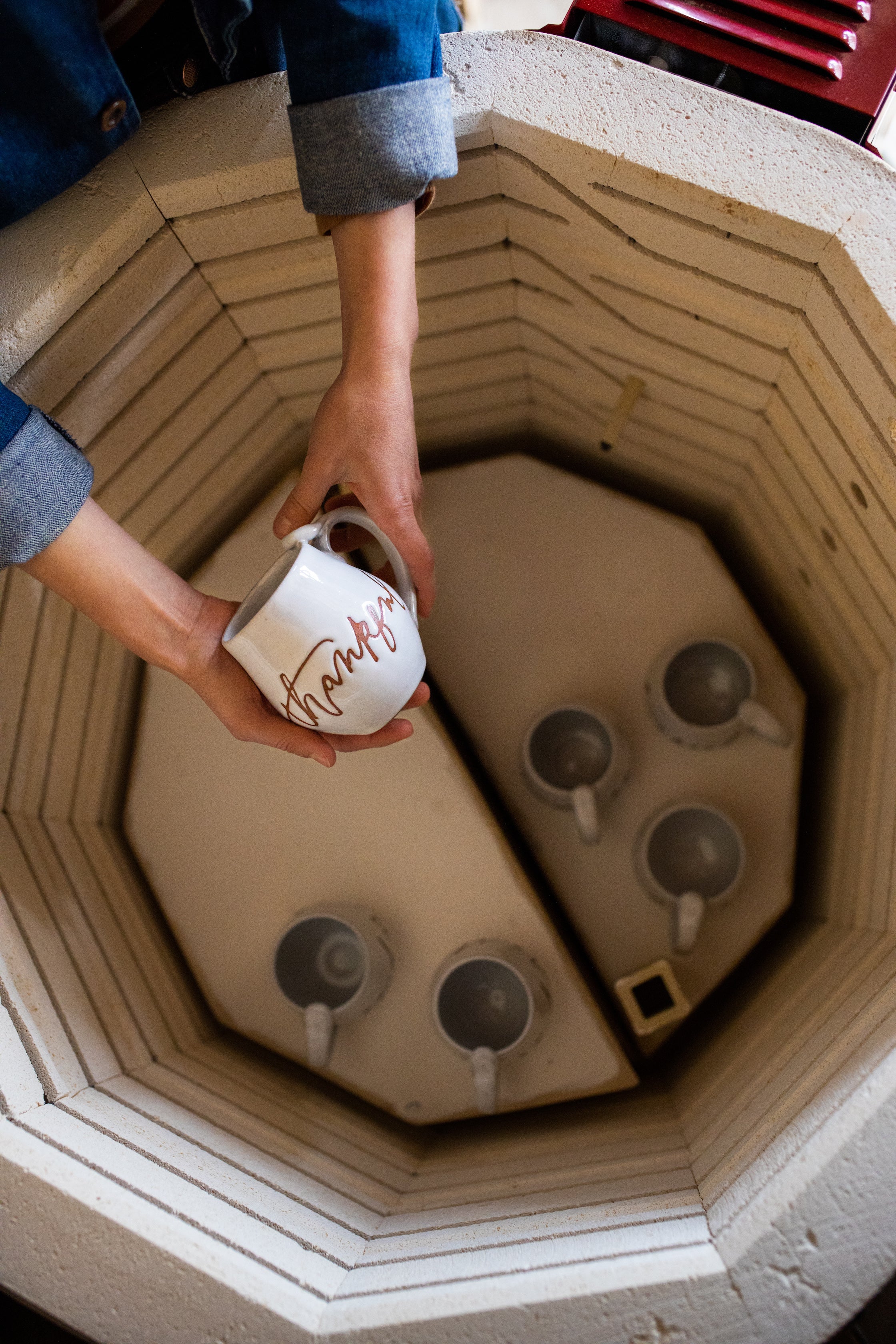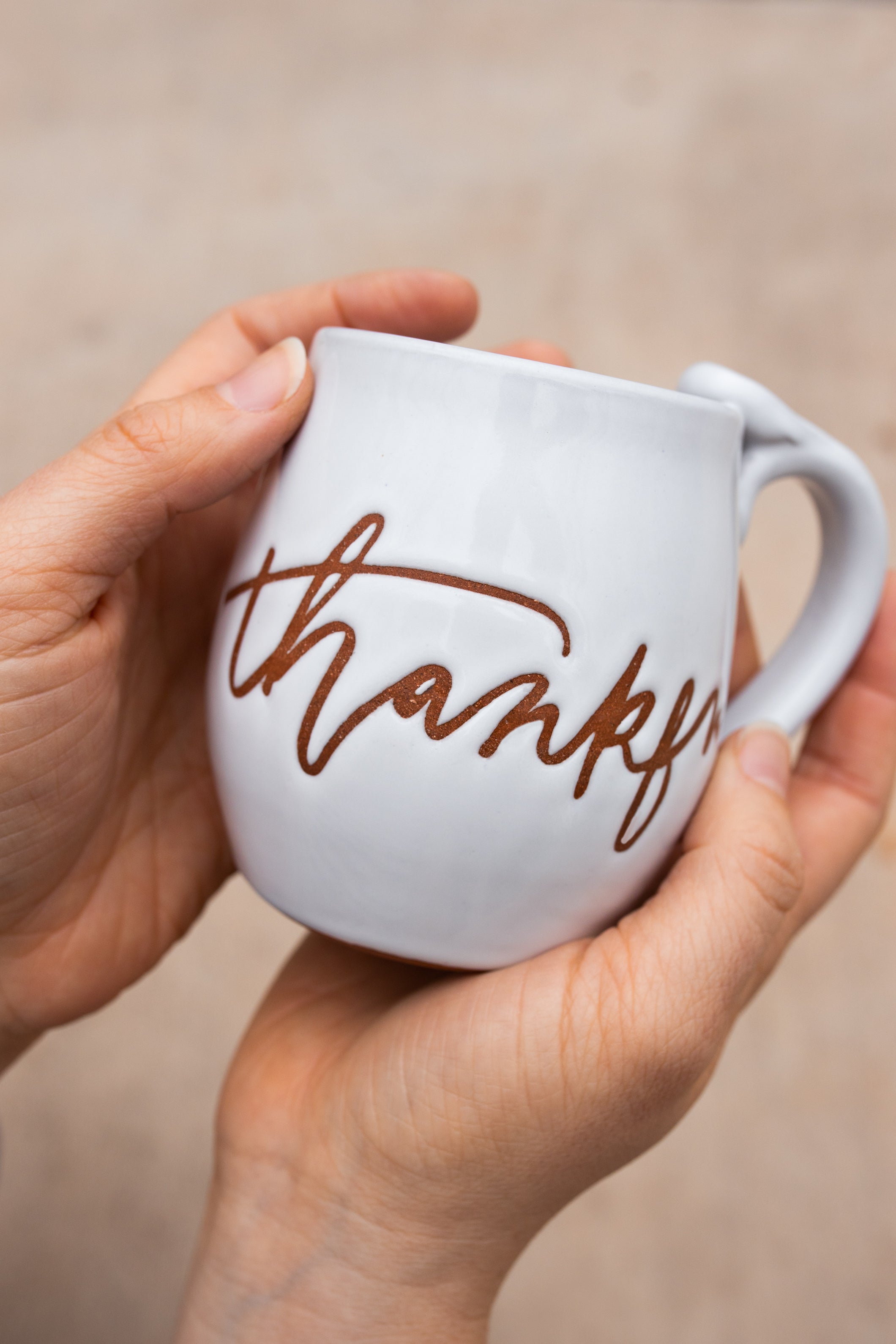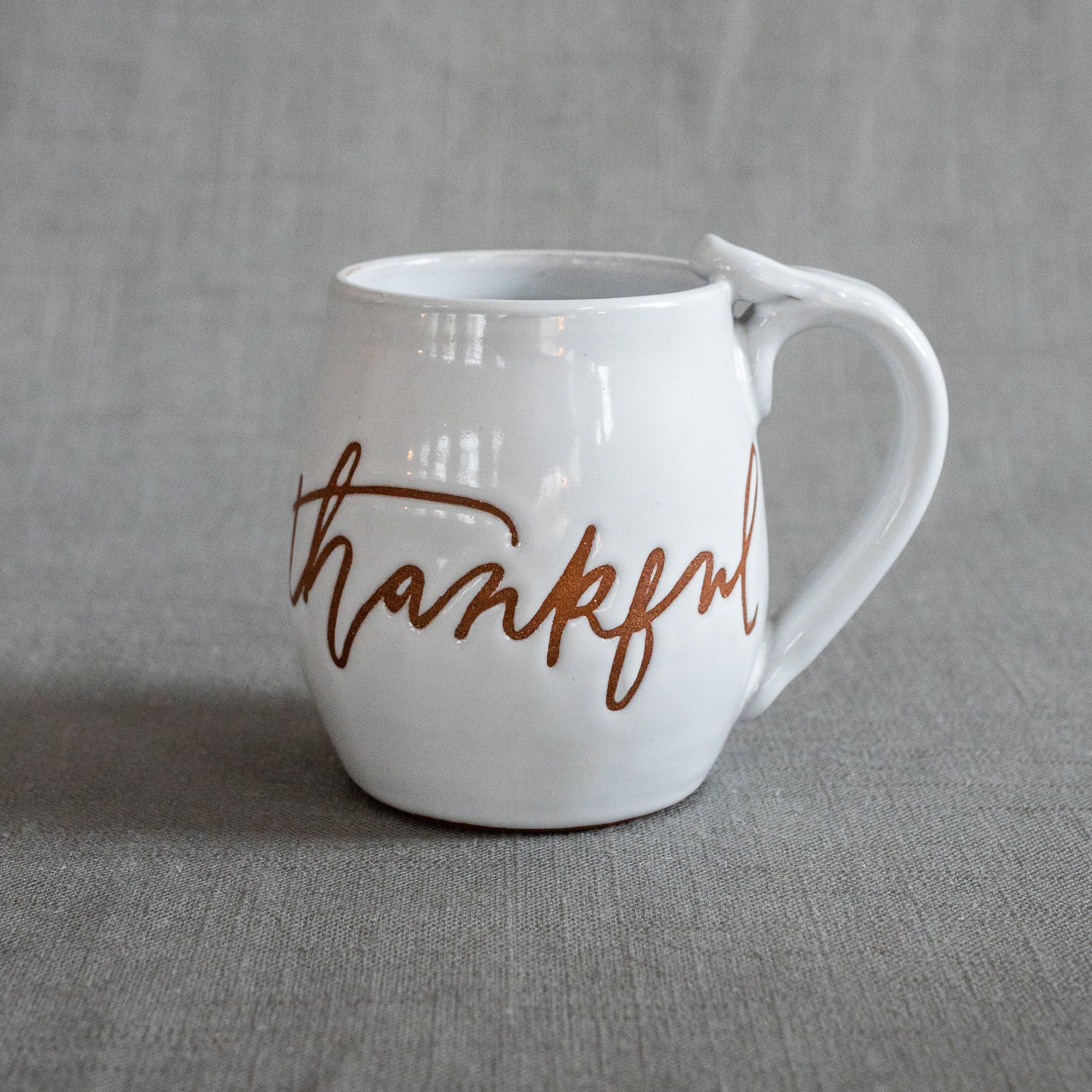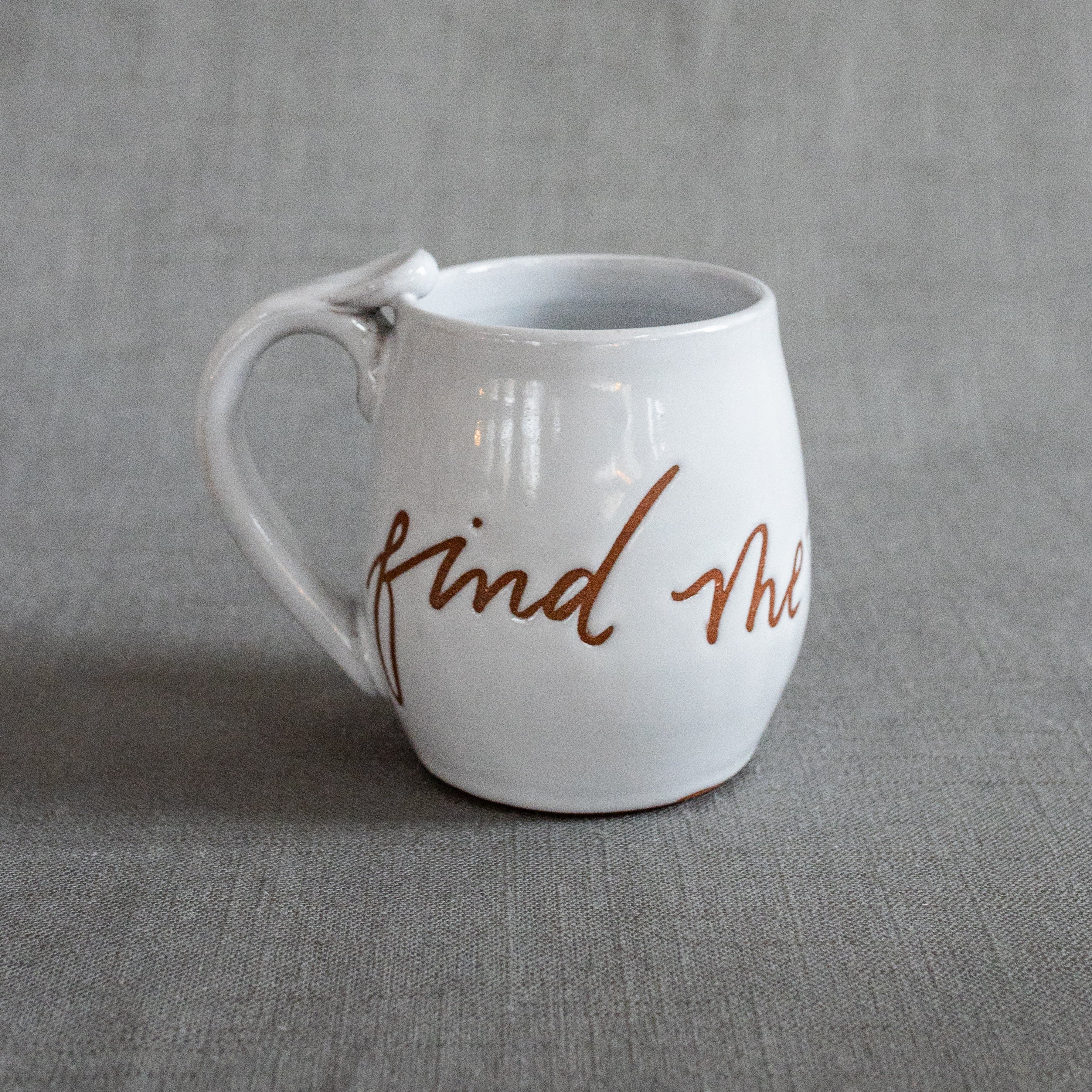 Crafted from North Carolina red clay, this stoneware mug features a beautiful calligraphy script "Find Me Thankful," a lyric from one of Jonathan David Helser's songs. In the simple moments of life, this mug is an invitation to engage gratitude. Whether it’s coffee in the morning or paired with your evening dessert, this mug will be the one you want to reach for everyday.